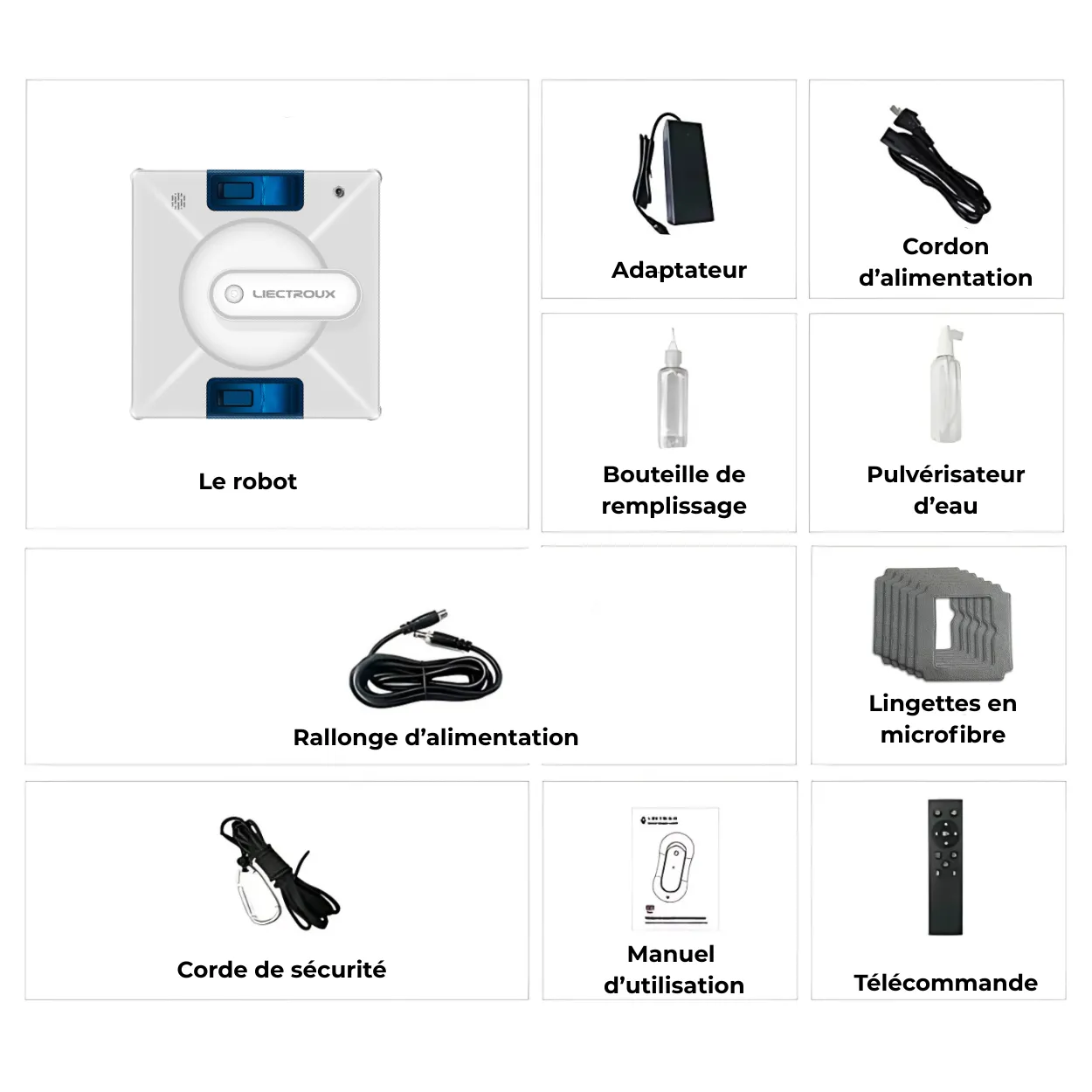 Le coffret inclut le robot lave-vitre Liectroux YW509, sa télécommande 2,4 GHz, l’alimentation secteur avec rallonge, ainsi que plusieurs chiffons microfibres lavables. Une corde de sécurité est également fournie pour une utilisation en hauteur. Selon le lot, des accessoires supplémentaires peuvent être ajoutés. Vérifiez toujours le contenu exact indiqué lors de votre commande.