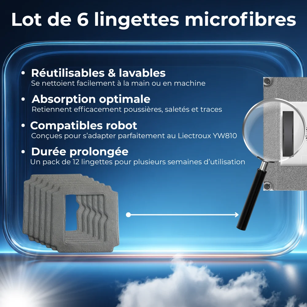 Améliorez l’efficacité de votre robot lave-vitres Liectroux YW509 grâce à ce pack de 6 lingettes microfibres de rechange. Conçues pour offrir une performance optimale, elles sont réutilisables, lavables et ultra-absorbantes. Ces lingettes garantissent un nettoyage sans traces et prolongent la durée de vie de votre appareil.