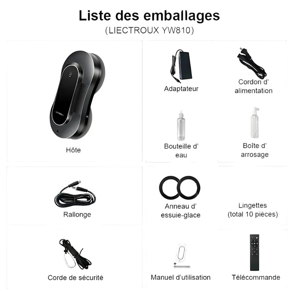Le coffret comprend le robot lave vitre Liectroux YW810, la télécommande, l’alimentation, et des chiffons microfibres. Selon le lot, d’autres accessoires peuvent être inclus (ex. corde de sécurité). Vérifier le contenu précis indiqué sur votre commande.