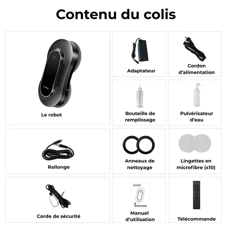 Le coffret comprend le robot lave vitre Liectroux YW810, la télécommande, l’alimentation, et des chiffons microfibres. Selon le lot, d’autres accessoires peuvent être inclus (ex. corde de sécurité). Vérifier le contenu précis indiqué sur votre commande.