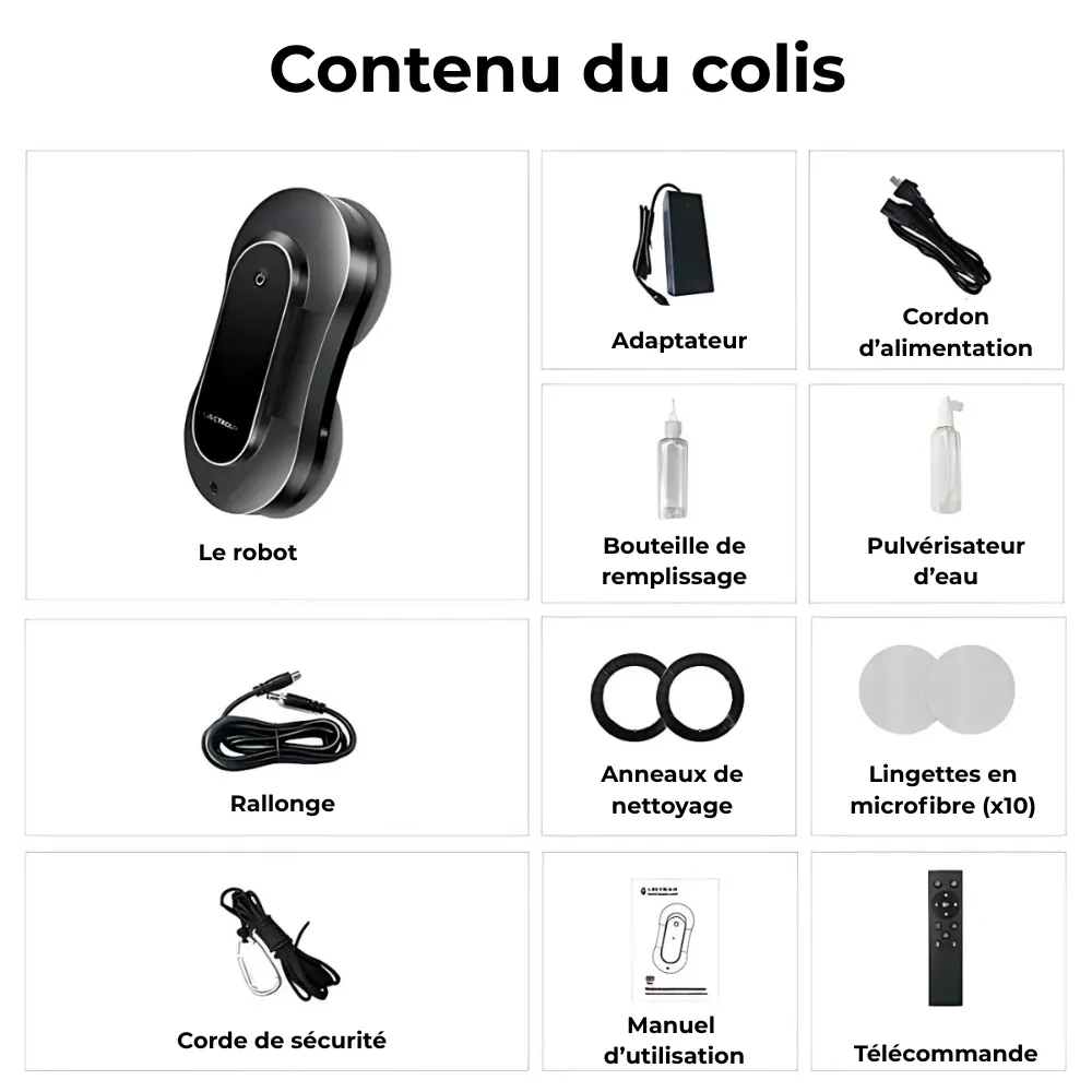 Le coffret comprend le robot lave vitre Liectroux YW810, la télécommande, l’alimentation, et des chiffons microfibres. Selon le lot, d’autres accessoires peuvent être inclus (ex. corde de sécurité). Vérifier le contenu précis indiqué sur votre commande.
